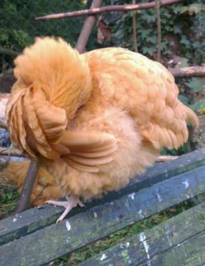 Orpington fauve qui arrange ses plumes, perchée sur un banc