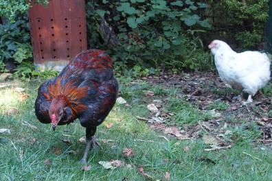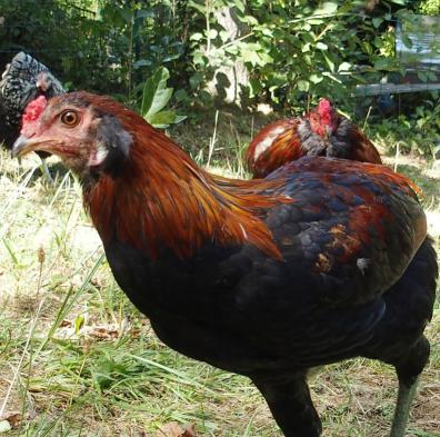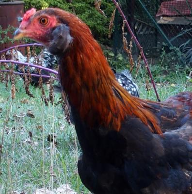 Il cohabite maintenant avec deux coquelets, un coquelet Araucana et un coquelet Orpington argenté de 5 mois, pour l'instant sans problème. Il faut dire que les coquelets commencent à chanter mais ne se hasardent pas encore à cocher.