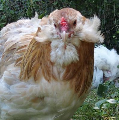Andro, le coquelet Araucana est particulièrement familier avec moi et suit tout ce que je fais avec une attention soutenue. Il est saumon brun et présente de jolis toupets d'oreilles.
